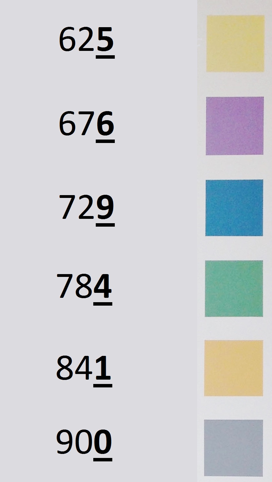 Each color in this work represents one of those numbers, 1, 4, 6, 9, 5, or 0 and writes out the final digits of the first 70 square numbers, reading from left to right. Below is a diagram of a small string of numbers, with their final digit emboldened, next to the color represented by that number: